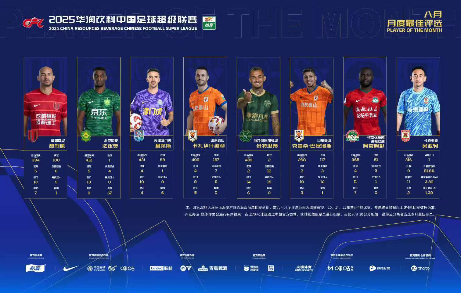 注:因第23轮大连英博海发对阵青岛西海岸比赛延期,故八月月度评选范围为联赛第19、20、21、22轮共计4轮比赛,参选球员数据以上述4轮比赛数据为准。