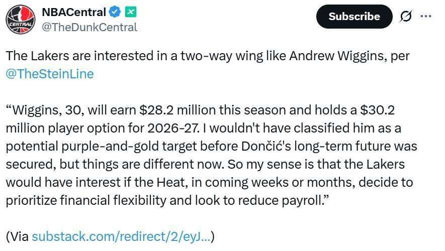 随着名记Stein曝出热火队有可能因为薪资灵活性与避税问题将维金斯摆上货架后,湖人队又被指出仍对这名前全明星锋线感兴趣。