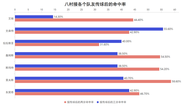 八村在本赛季接东契奇、里夫斯、斯玛特与詹姆斯传球后的出手均保持了较高的得分效率,三分线内与三分线外的命中率分别在50%与40%左右,湖人由于东契奇与詹姆斯的存在多数时间都处于持球大核组织进攻,八村要做的就是接到传球后将球放入篮筐减轻持球大核的压力与被针对,而八村也把这个任务完成的较为不错。