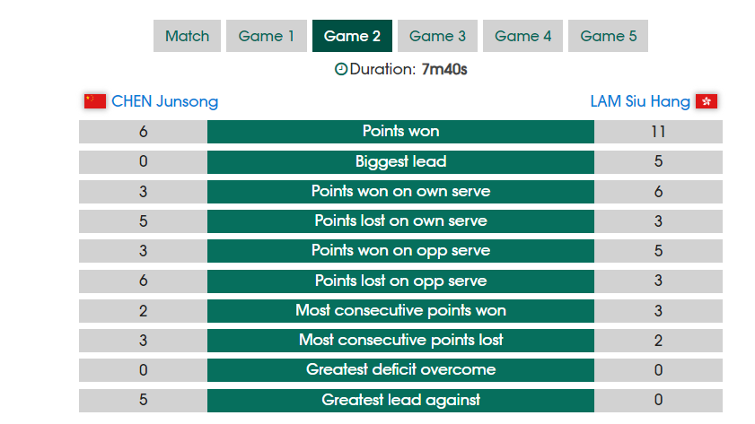 第二局陈俊菘的攻势明显下滑,林兆恒连续的反手进攻拿分,陈俊菘跟第一局判若两人,进攻端也很犹豫,连续的摆短不敢侧身,林兆恒轻松11-6扳平大比分。