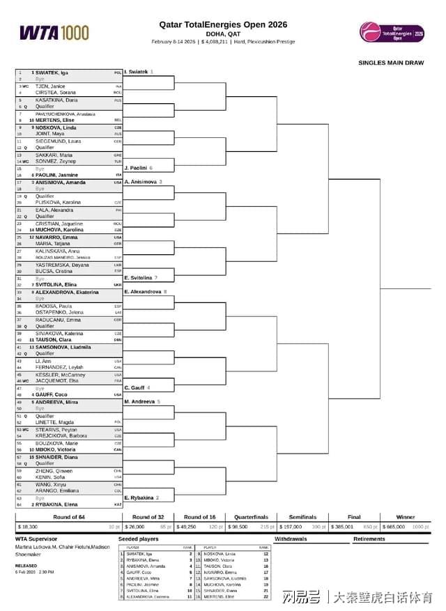 根据WTA国际女子网球协会2月6日的消息: